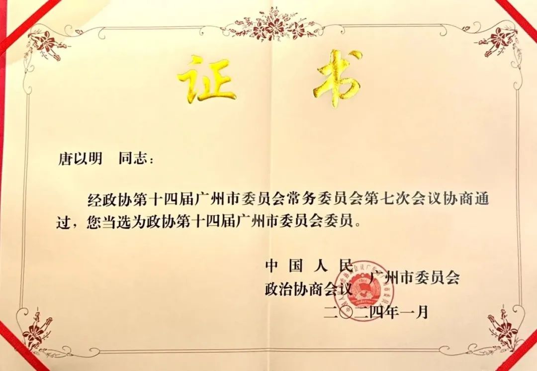 近日,经政协第十四届广州市委员会常务委员会第七次会议协商通过,唐以明主任补选为政协第十四届广州市委员会委员。