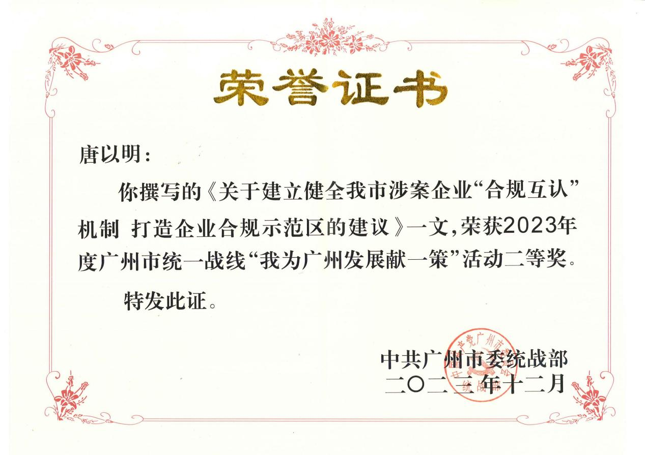 唐以明主任荣获2023年度广州市统一战线“我为广州发展献一策”活动二等奖