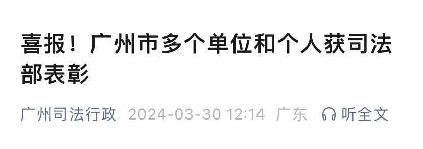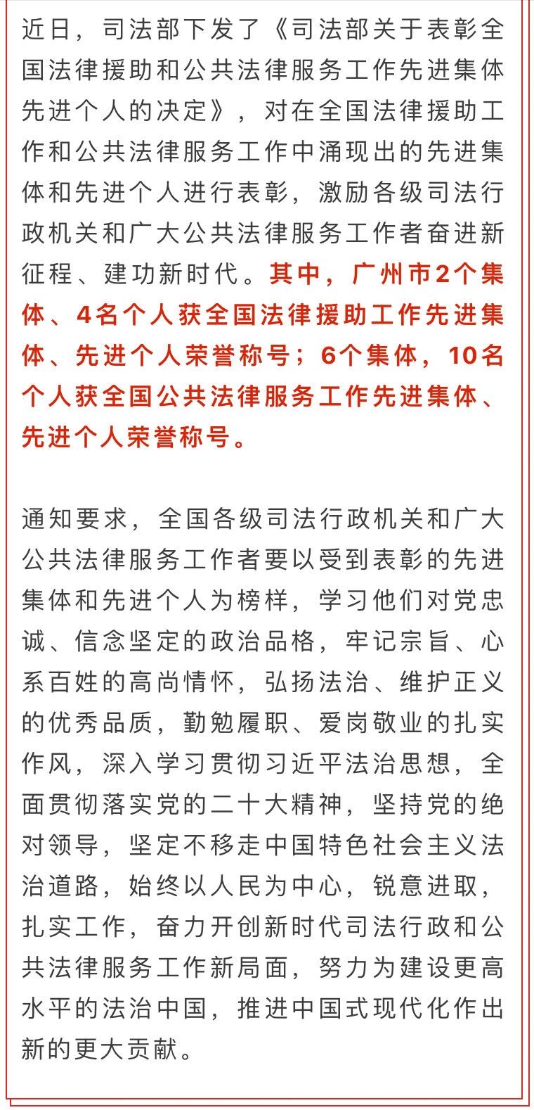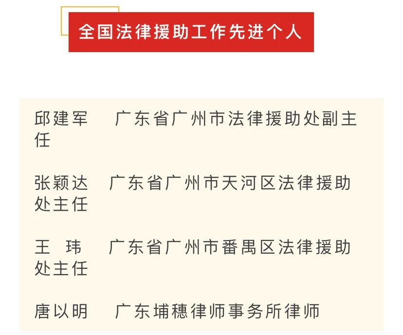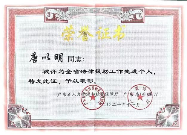 唐主任热心社会公益,积极投身法律援助等公益法律服务,始终践行人民律师为人民的服务理念,以维护当事人的合法权益、维护法律的正确实施、维护社会公平和正义为己任,获得众多委托人、受援人的好评。多次捐助善款给广州市法律援助基金会,亲自参与法律援助案件承办、公益普法授课、公益法律咨询、法援案件质量评比等,2021年11月被广东省人力资源和社会保障厅、广东省司法厅评为“第四届全省法律援助工作先进个人”。本次获全国表彰,是各级司法行政机关对其多年来支持、参与法律援助工作的充分肯定。