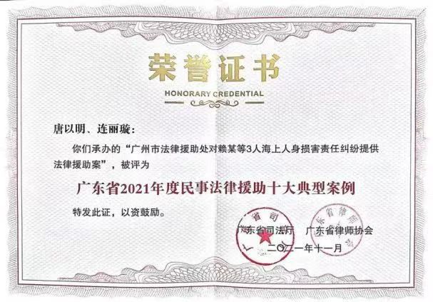 唐主任办理多宗疑难且社会影响大、关注度高的敏感性死刑案件;承办的77岁高龄唐婆婆曾向各级主管部门投诉、协调追讨养老床位款1年未果的案件,唐以明律师仅用41天时间,促成养老机构和唐婆婆和解并追回相关款项,受援人挽回损失后,捐赠5000元给广州市法律援助基金会,实现了爱心传播,得到媒体广泛宣传报道,其中广州电视台专题片《法援有爱·夕阳更红》,获全国老龄新闻宣传好作品三等奖;承办的海上人身损害责任纠纷案件,为避免境外被告执行难问题,力推调解结案,为被事故责任认定机构认定需承担主要责任、农村户口一方的继承人(受援人)争取到73万元的调解赔款并立即到位,该案被办案单位广州海事法院报道以及诸多媒体广泛报道,获评“广东省2021年民事法律援助十大典型案例”,入选中国法律服务网司法行政(法律服务)案例库……。